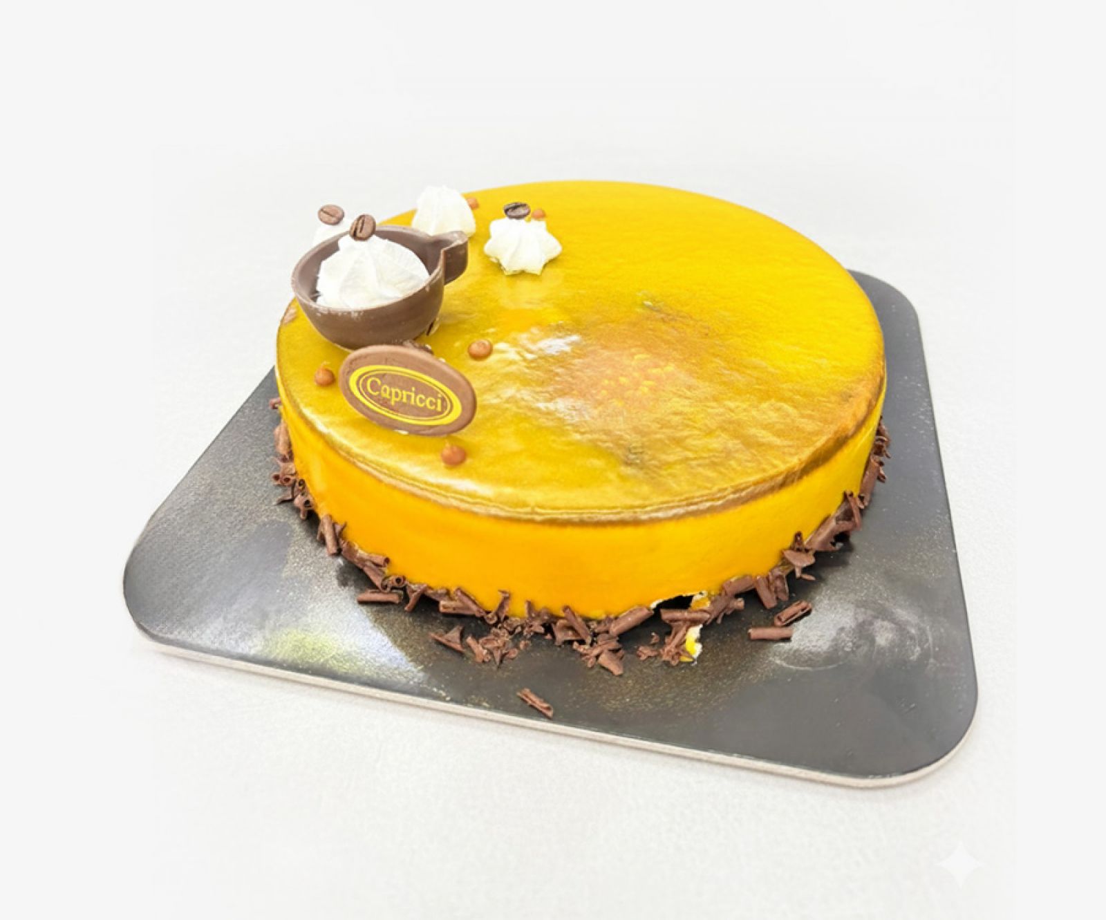 Base finanziere cioccolato, croccante ai cereali e cioccolato, caramello mou, mousse al caramello, cremoso al caffè e mascarpone con glassa oro